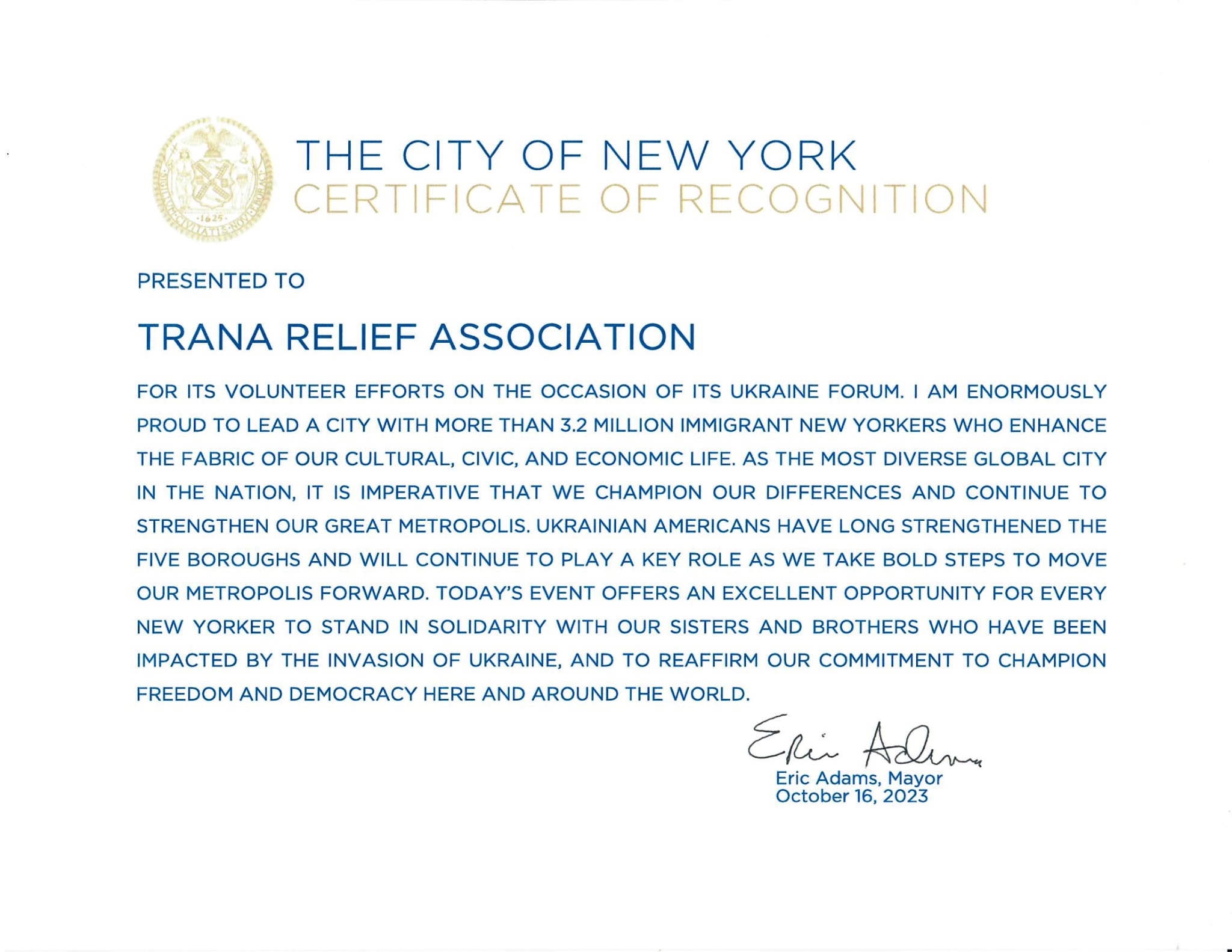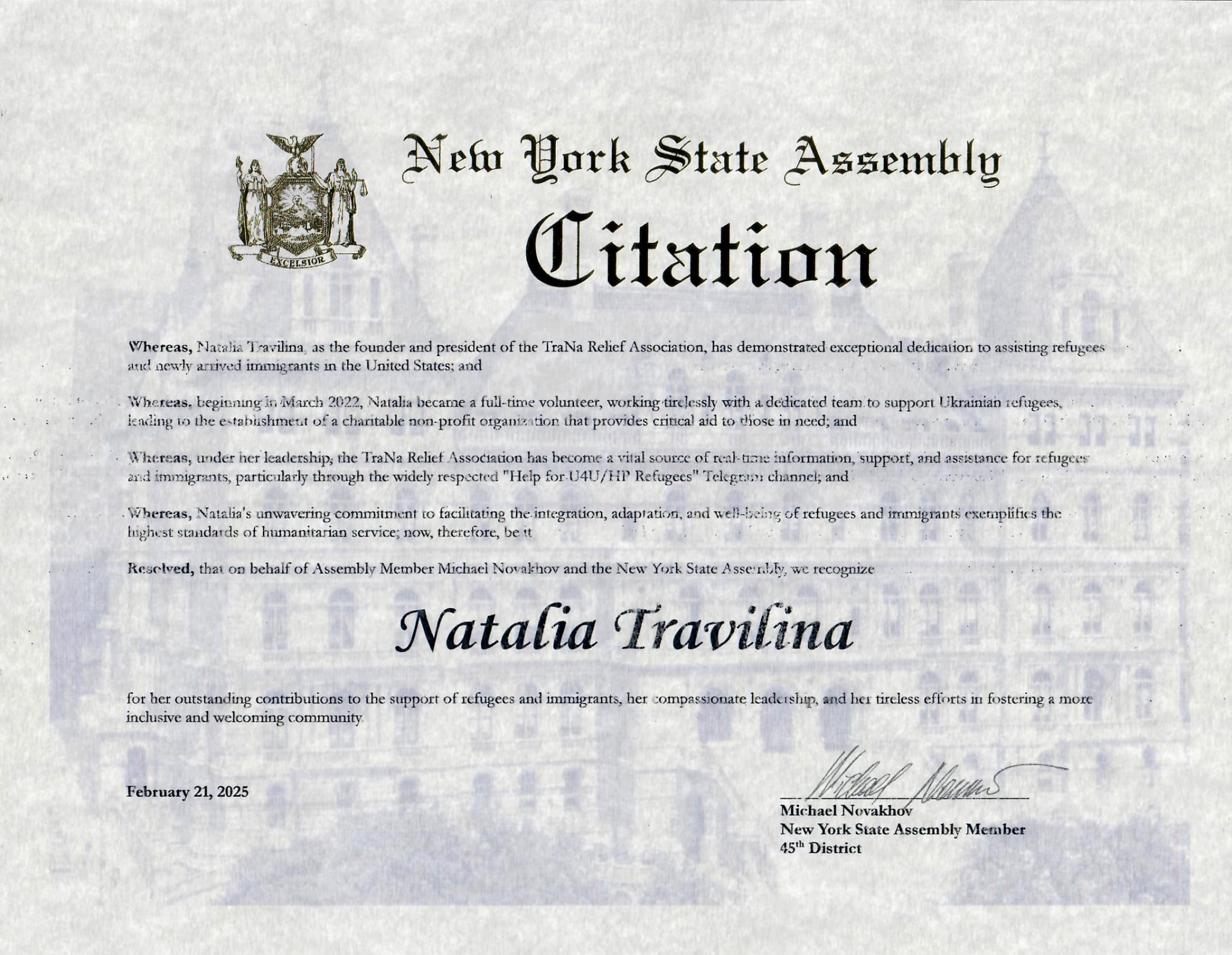 TraNa Relief Association is a New York/New Jersey–based nonprofit committed to supporting lawful Ukrainian refugees and individuals from the former USSR who have sought safety and a new beginning in the United States.